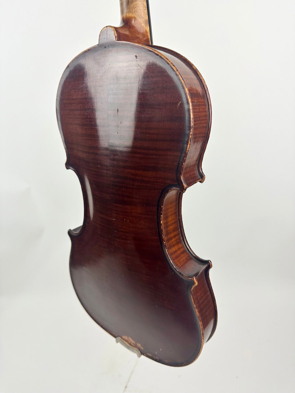 1920's (approximate) Strad copy made in Germany. In great condition for its age, showing the usual scuffs and dings and finish abrasions. This violin has been professionally set up and plays wonderfully with no issues. Great old and seasoned tone that leans slightly to the darker end of the spectrum. Nice balance across the strings and up and down the neck. This would make a wonderful vintage alternative to the lower quality new violins available in this price range. Comes with a case that appears to be from the 80s and is serviceable.