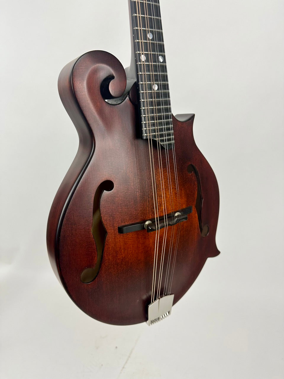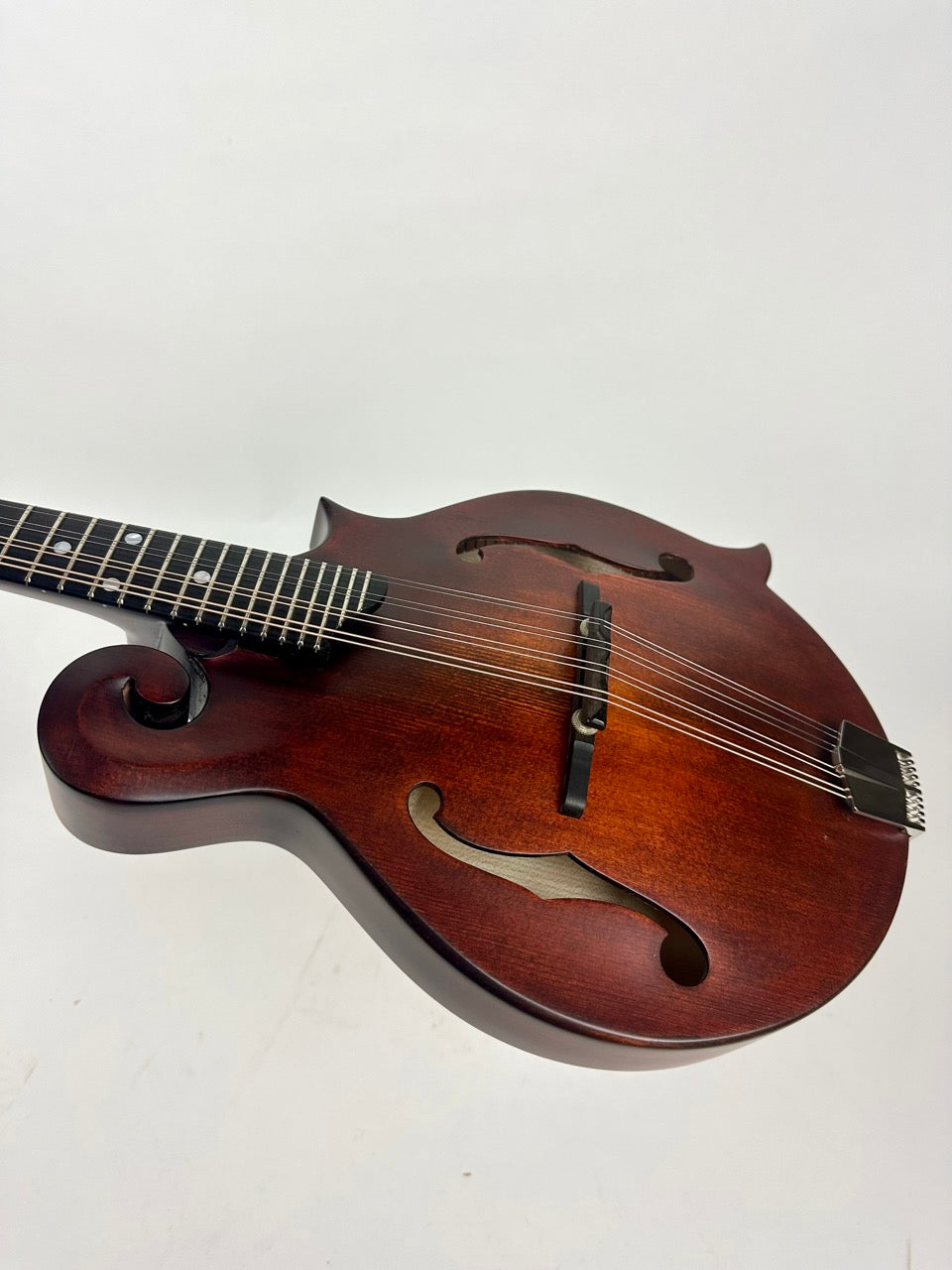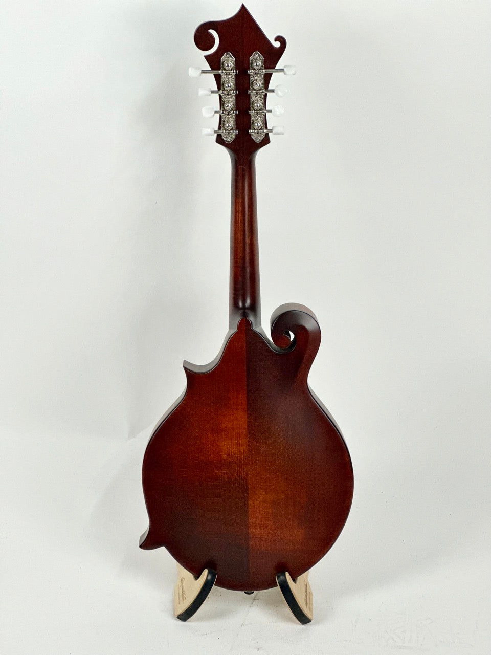 This is an incredible value in a quality F5 mandolin! Good tone with ample volume to be heard in an ensemble, this mandolin was just professionally set-up and plays great in all positions with no issues whatsoever. The bridge was also upgraded to an ebony Weber (Sound To Earth) bridge. This model features rounded edges that offer more comfort for the right arm as well as a unique look. It would be very hard to find a better F5 mandolin at this price!