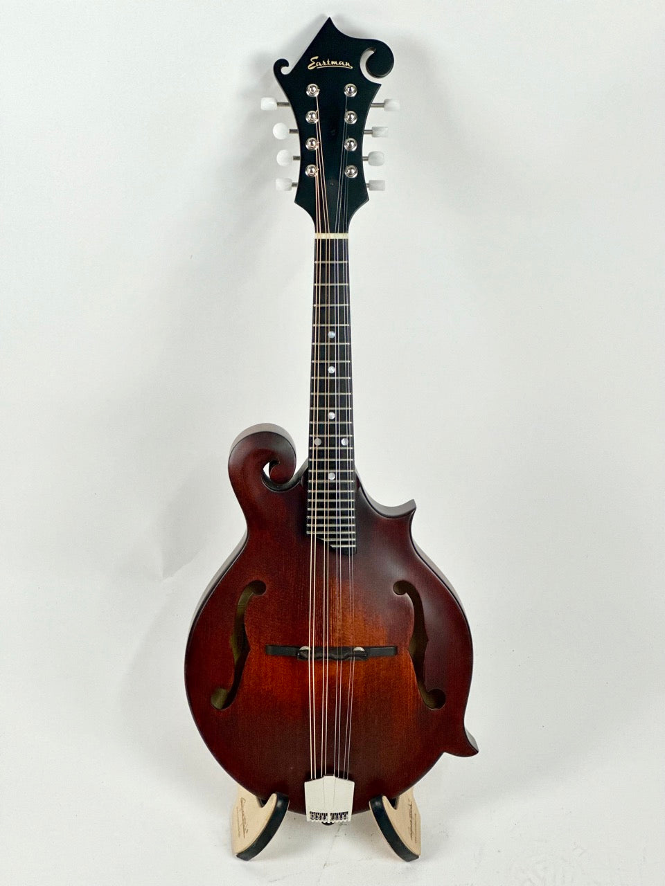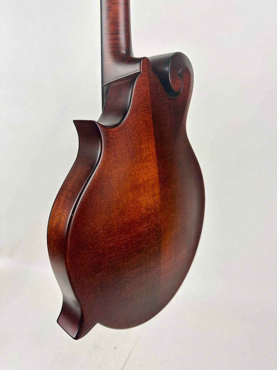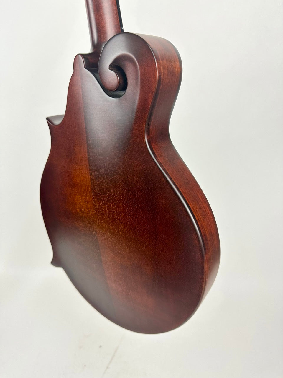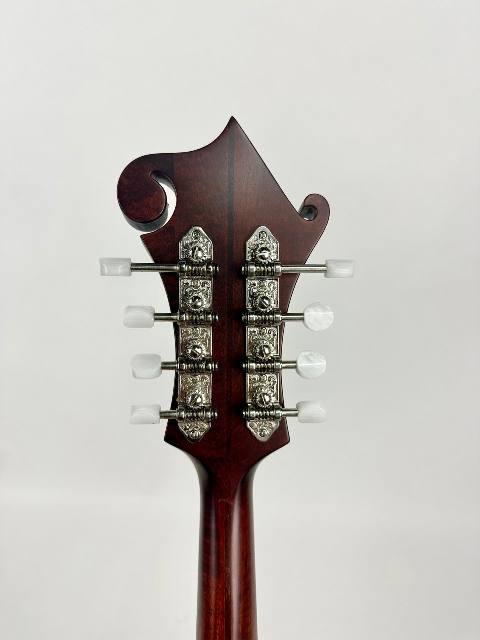 This is an incredible value in a quality F5 mandolin! Good tone with ample volume to be heard in an ensemble, this mandolin was just professionally set-up and plays great in all positions with no issues whatsoever. The bridge was also upgraded to an ebony Weber (Sound To Earth) bridge. This model features rounded edges that offer more comfort for the right arm as well as a unique look. It would be very hard to find a better F5 mandolin at this price!
