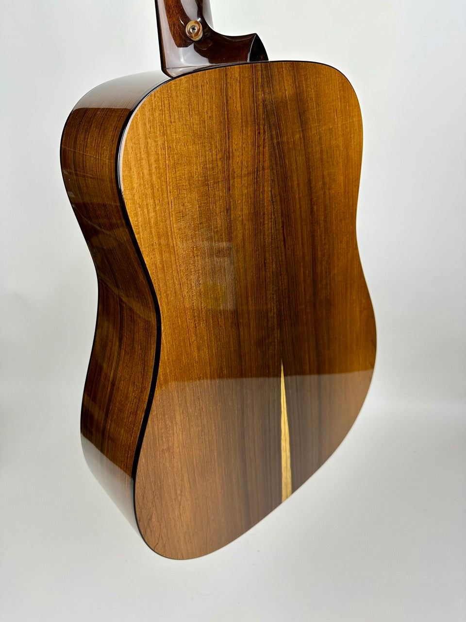Adirondack sppruce top, Brazilian rosewood back and sides, mahogany neck, ebony fretboard w/small pearl postion markers, ebony bridge, tortoise binding, tortoise pickguard, tortoise strap button and endpin, Waverly tuners, 1-3/4" bone nut, bone compensated saddle w/ 2-1/4" string spacing, 25" scale length. Deluxe TKL hardshell case included.