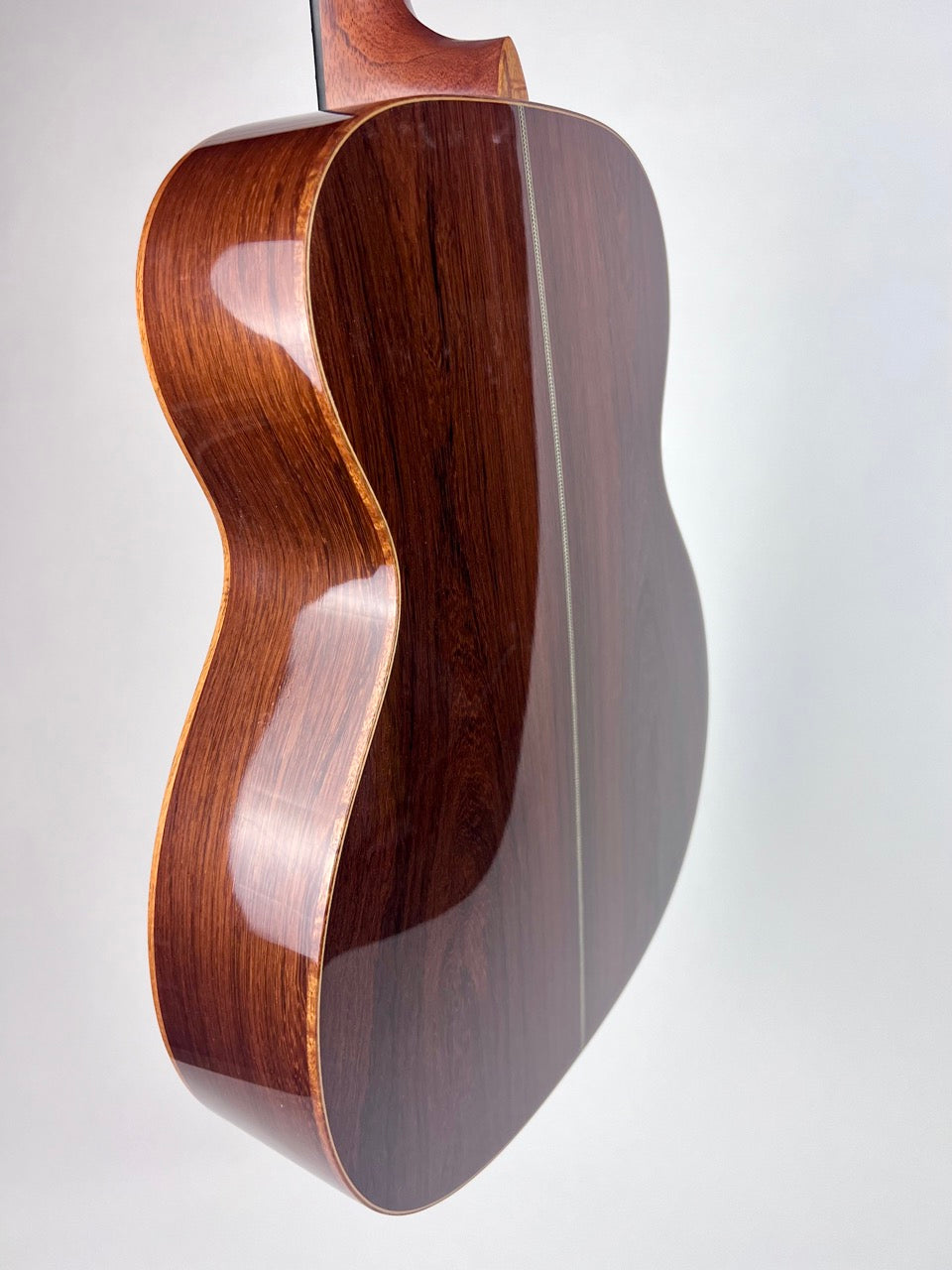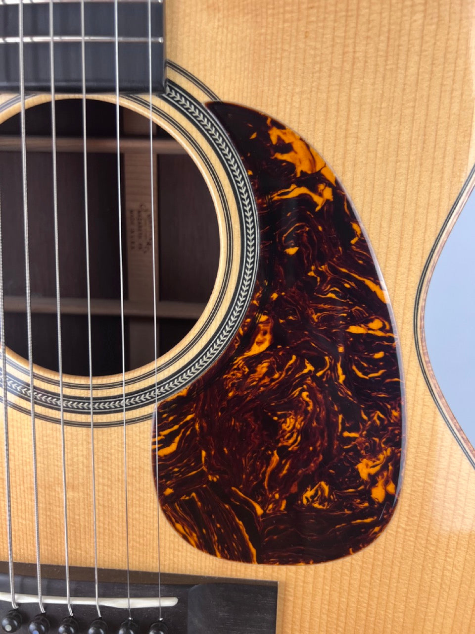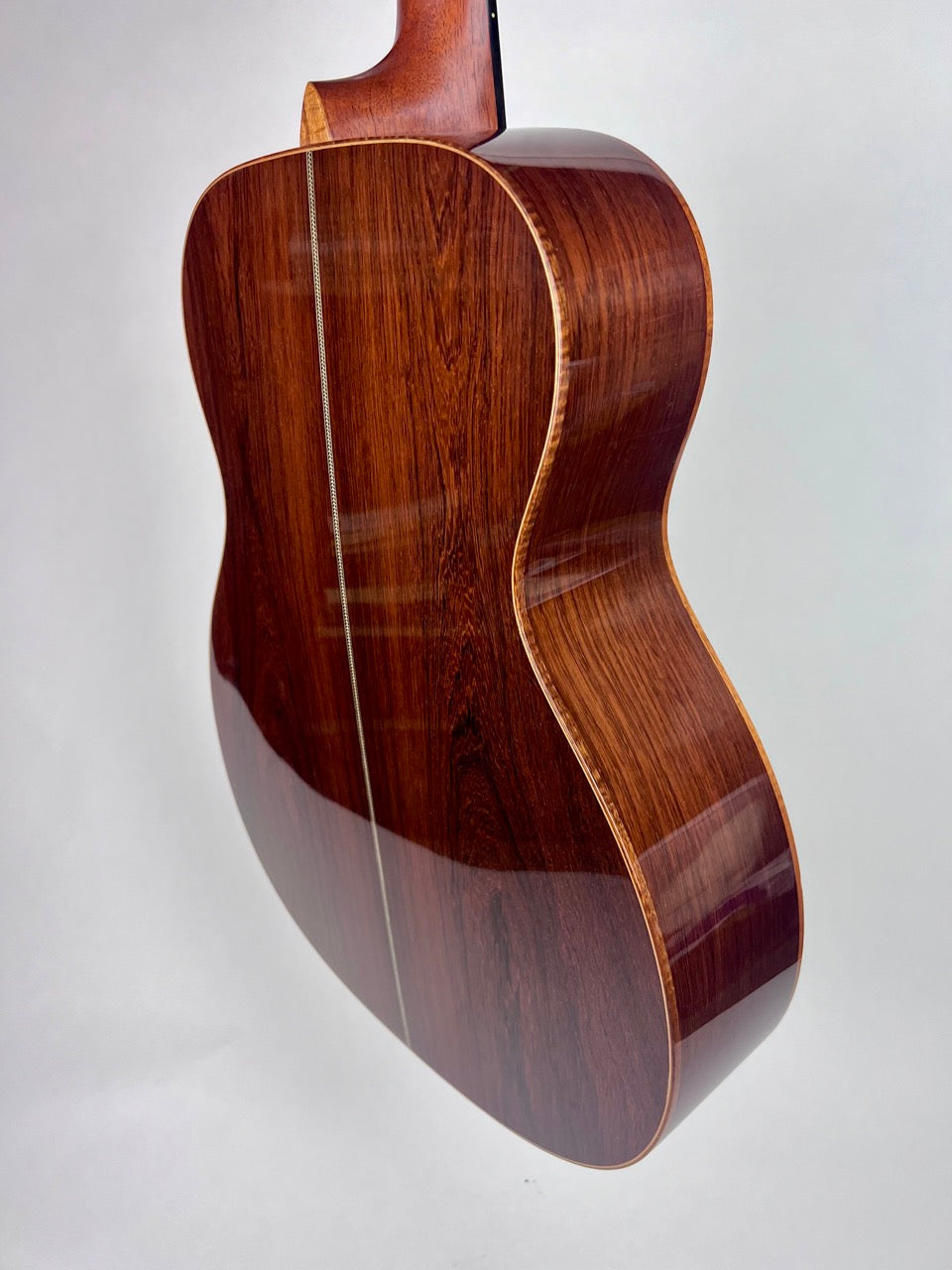 This is an incredible guitar with an absolutely beautiful tone! All of the power of a great dreadnaught with the presence and balance of a smaller guitar. This is a true "do everything" desert island instrument that would be equally at home played finger style as it would flat picked. Deep, rich tonal character that is offset in the most perfect way by crisp, clear definition and cutting power. The set up is wonderful and it plays great in all positions with no issues whatsoever.