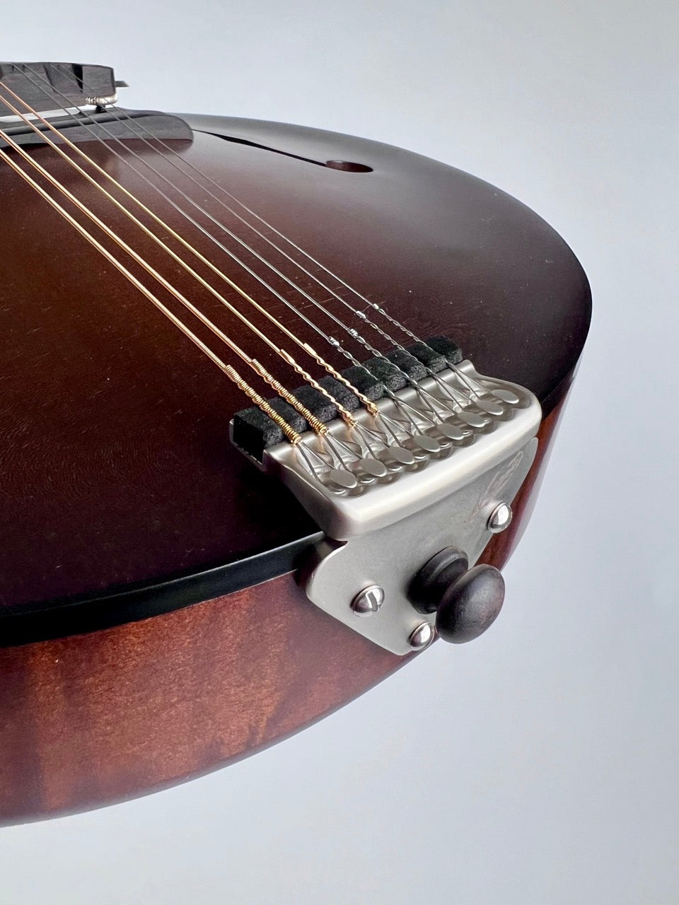 A brand new Model M just in from Northfield. This mandolin easily holds it's own with instruments costing much, much more. The tone has a beautiful depth and complexity while still retaining amazing clarity and note separation. A quality found in only the finest mandolins. While somewhat simply appointed, this instrument is absolutely gorgeous and we doubt that the pictures do it justice. The highly flamed dark back and sides just pop, and the fit and finish are top level. The setup is perfect and exemplifies Northfield's reputation for buttery playability. Special Engelmann spruce top, highly flamed maple back/sides/neck, varnish finish, Nugget tailpiece, ebony adjustable bridge, ebony fretboard, Gotoh nickel tuners with black buttons, 1-1/8" bone nut, radiused fretboard. Comes with a Northfield Airloom Recurve case.