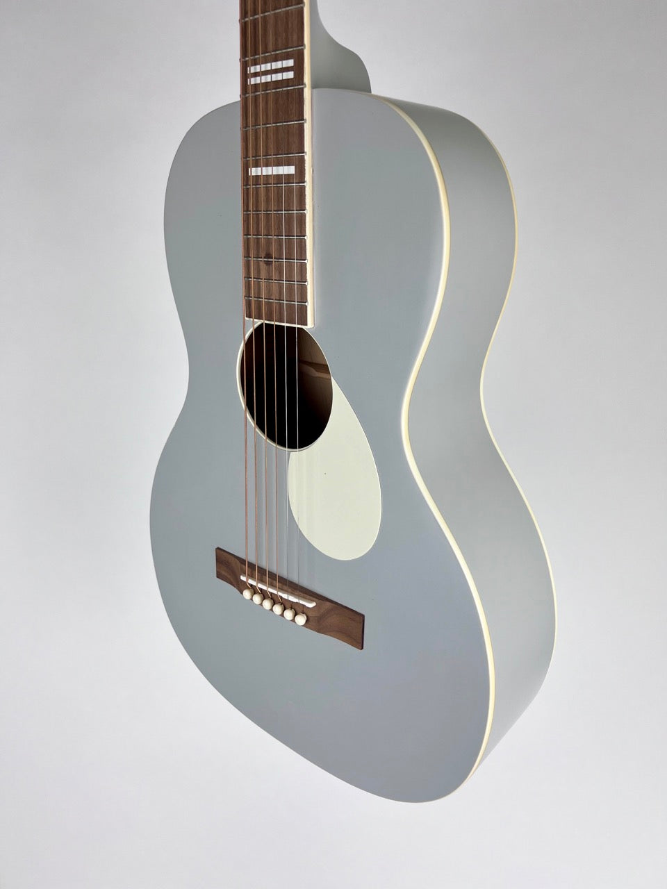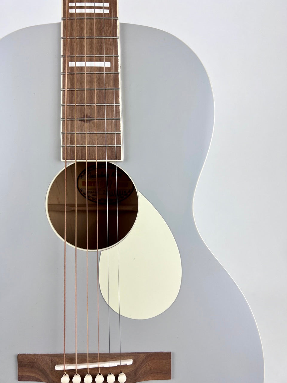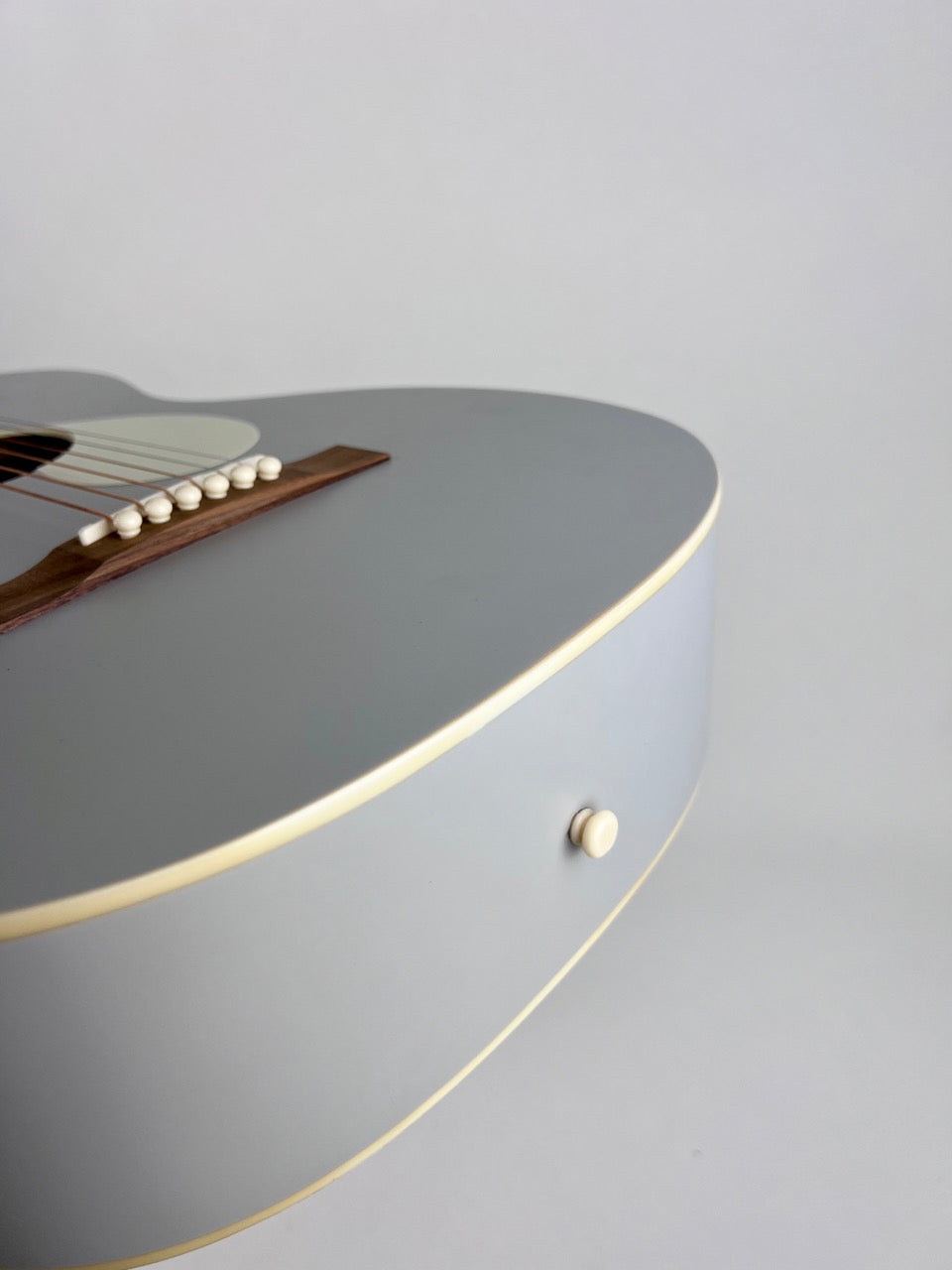 The blue-gray matte finish, framed by vintage-style checkerboard binding is a classic take on parlor guitars from the 1930s. The bound soundhole and Harmonella stencil fretboard markers are both functional and stylistic. it also includes bone nut and saddle, and ivory button tuning machines. Whether headed out on the road or matching the vibe of an intimate session, the Dirty 30s 7 RPS-7 is sure to be a go-to-guitar.