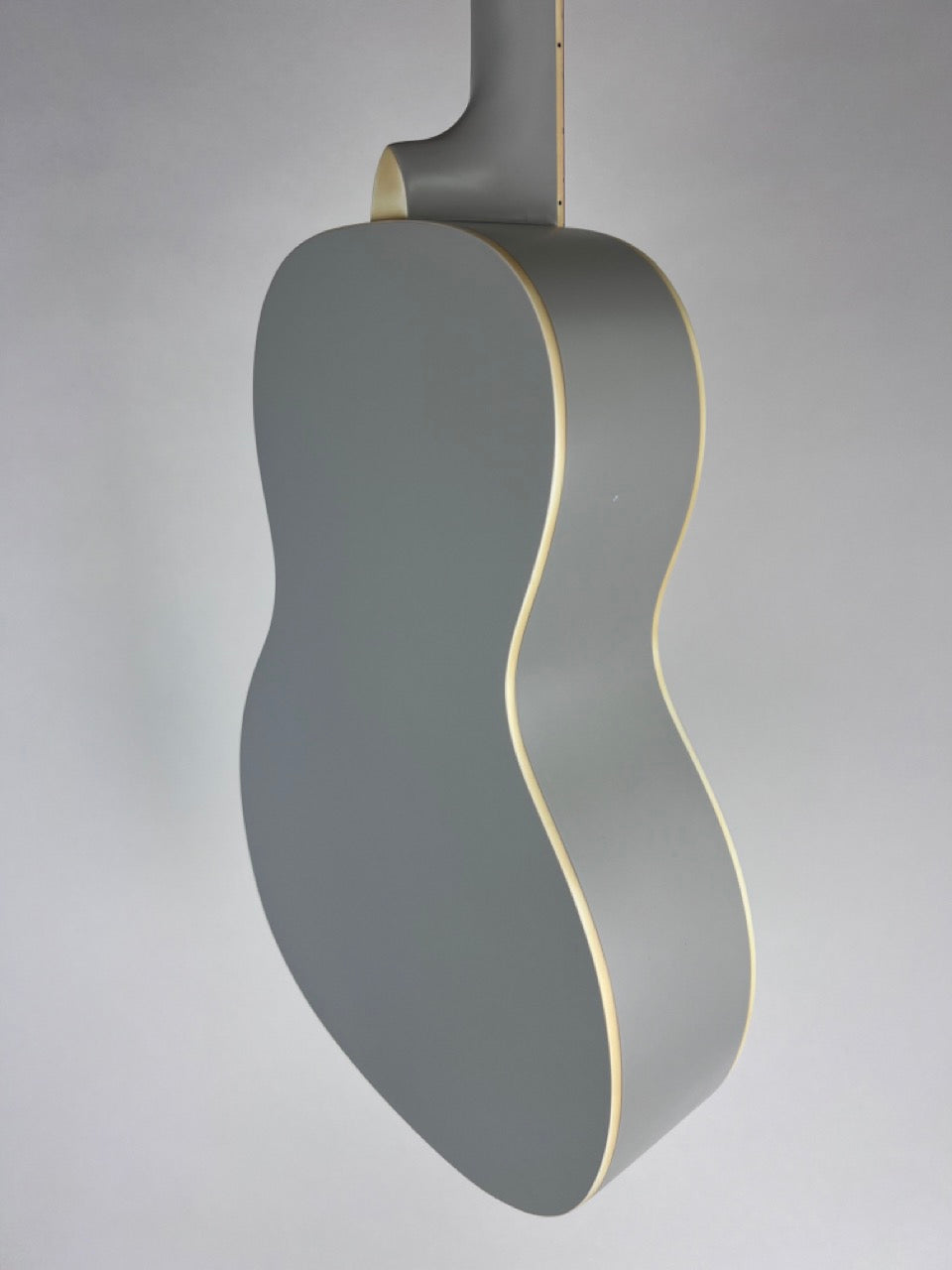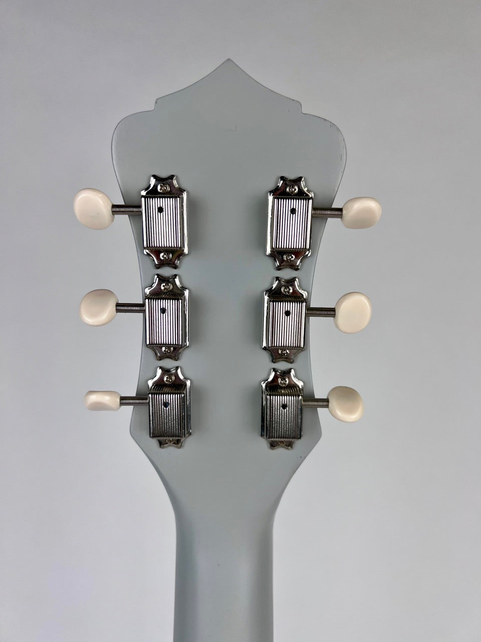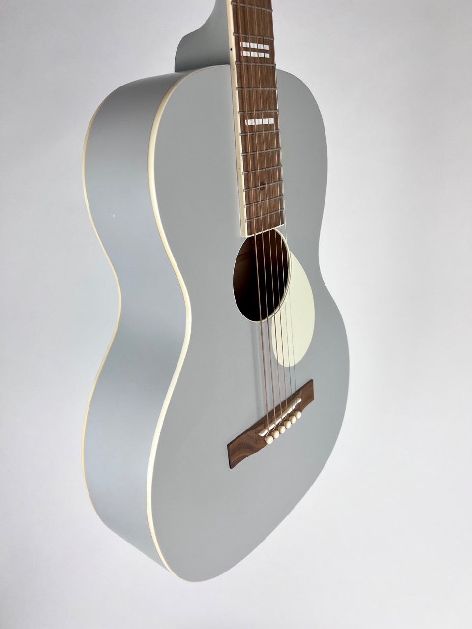 The blue-gray matte finish, framed by vintage-style checkerboard binding is a classic take on parlor guitars from the 1930s. The bound soundhole and Harmonella stencil fretboard markers are both functional and stylistic. it also includes bone nut and saddle, and ivory button tuning machines. Whether headed out on the road or matching the vibe of an intimate session, the Dirty 30s 7 RPS-7 is sure to be a go-to-guitar.