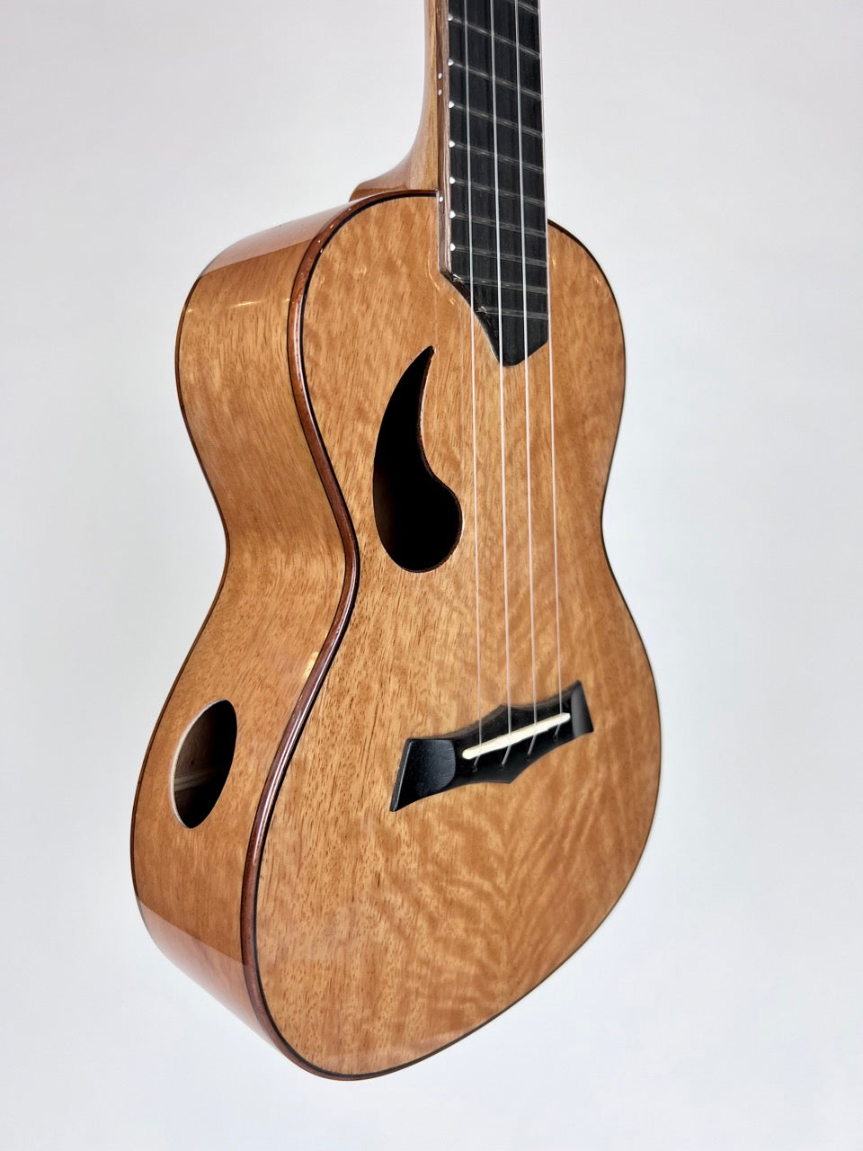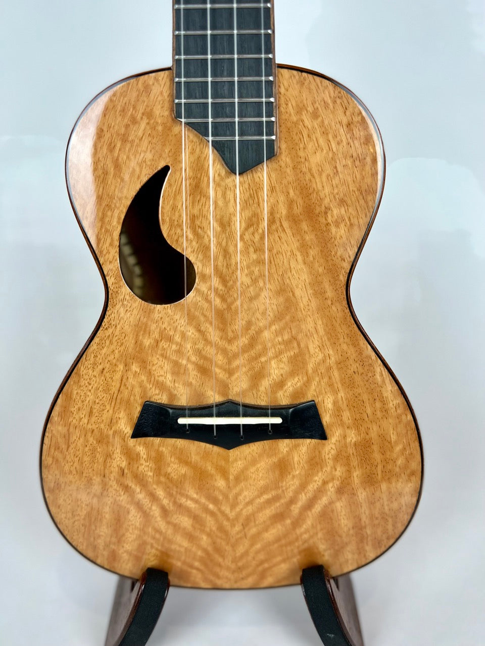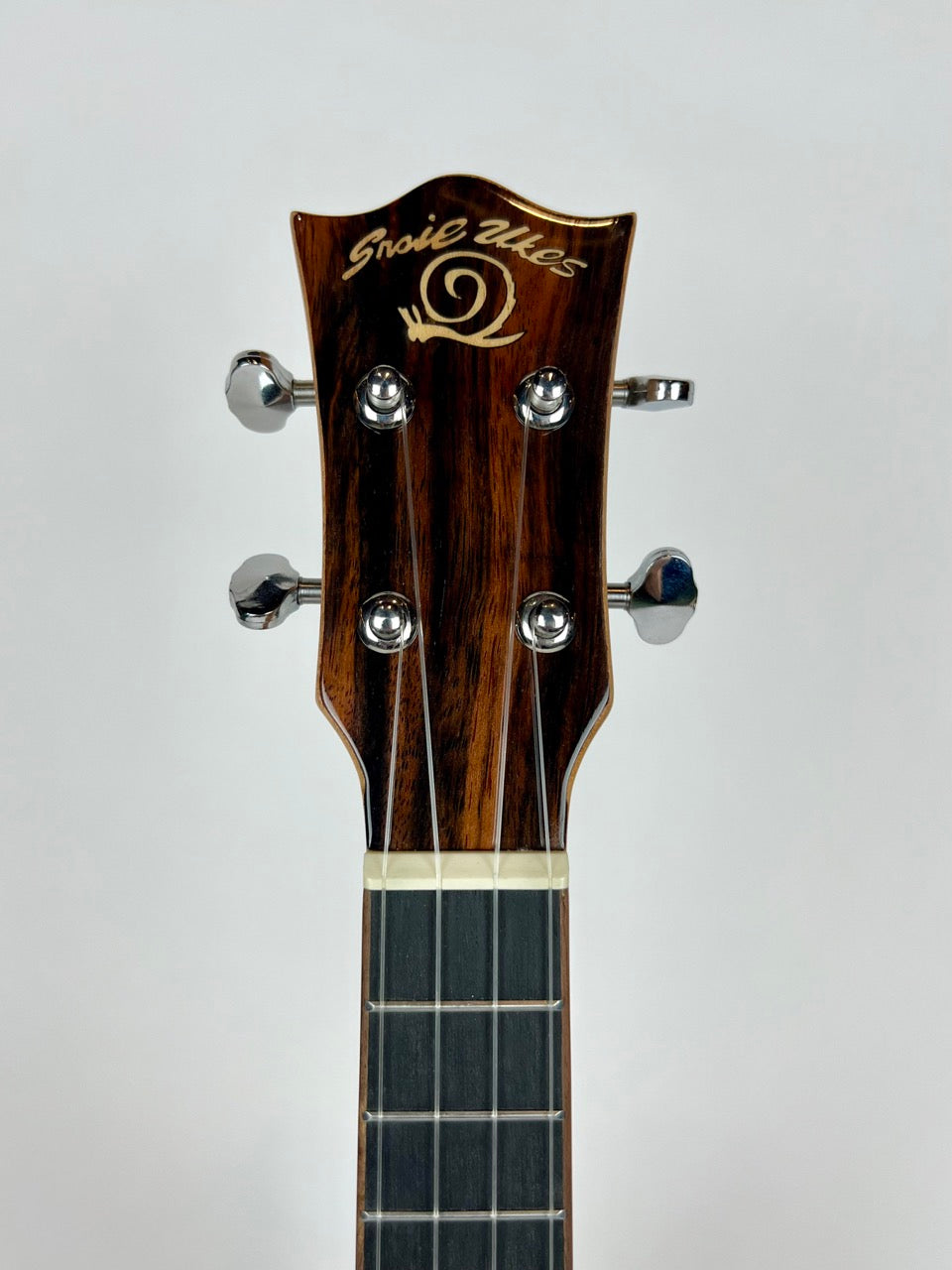 A beautiful and unique concert ukulele from Snail. The teardrop sound hole and side port offer a wonderful and different tonal experience. Lots of snap and pop but also a nice warm complexity underneath. *wood figure will vary on individual instruments. Comes with a gig bag.
